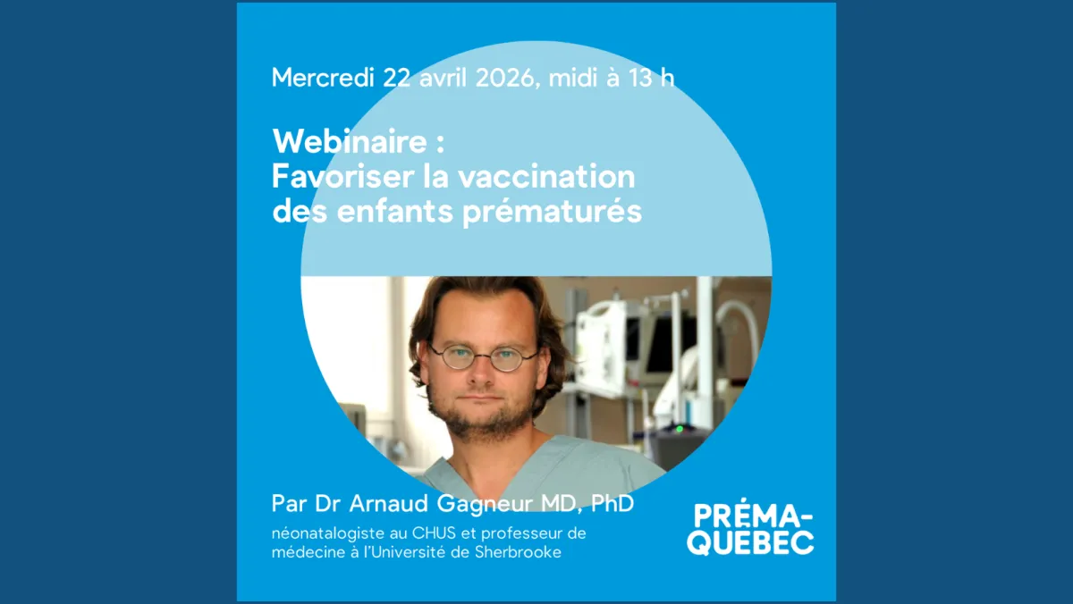 Préma-Québec vous invite à un webinaire gratuit d’une durée d’une heure intitulé «Favoriser la vaccination des enfants prématurés», présenté par le Dr Arnaud Gagneur, néonatalogiste au CHU de Sherbrooke et professeur de médecine à l’Université de Sherbrooke.